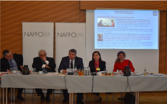 den „mutmaßlichen Giftgasangriff“ seitens der syrischen Regierung gegen die Zivilbevölkerung (7. April 2018 in Douma ). Grigoriev sieht seine Schilderung als Beweis einer Inszenierung des Giftgasangriffs. Hier wandte die geschäftsführende Direktorin Mirjam Rosenstein ein, dass NAFFO diesen Schilderungen kritisch gegenüberstehe, da die OPCW Untersuchungen, nach Ansicht der Bundesregierung und anderer Staaten, eine klare Verantwortlichkeit der syrischen Regierung belegten.